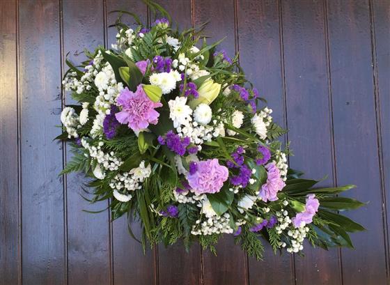 1.5ft Single Ended Spray in mixed lilac, white & purple flowers including a lily.