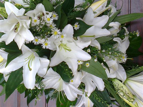 2ft single ended spray of all white oriental lillies with mixed foliages.