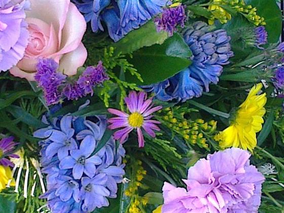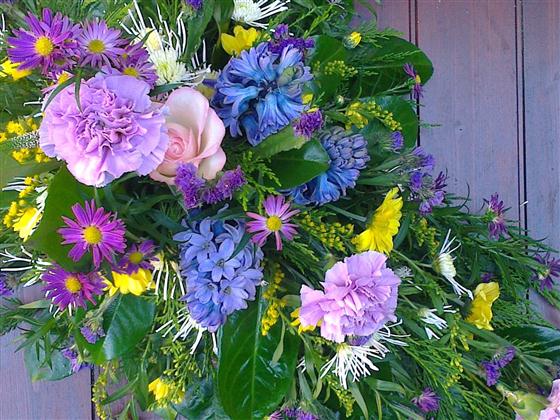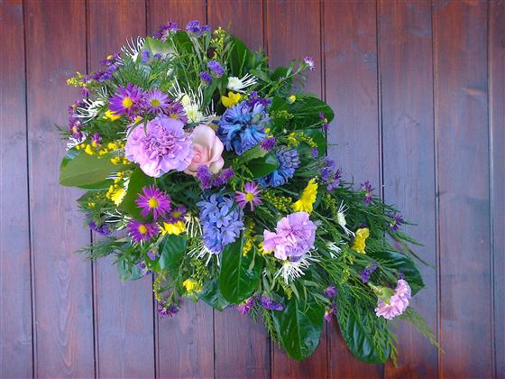 1.5ft single ended spray with a lovely mixture of mixed purples, pink, white and yellow flowers and some complimenting foliages.