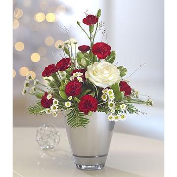 A stunning festive arrangement in perfect christmas colours, red and white, all in a complimenting festive container.