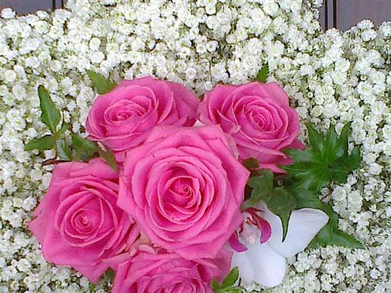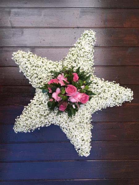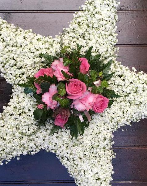White gypsophilia five point star, approx 12" wide with a pink rose spray.(other colours available)