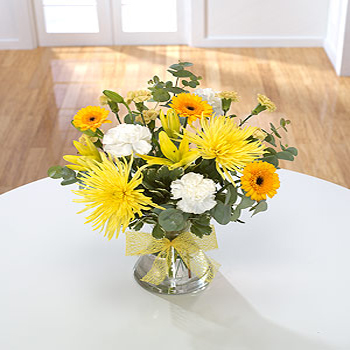 A beautiful mixture of yellow and white flowers with mixed foliages in a glass vase. A little ray of 'Sunshine'!