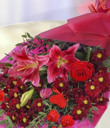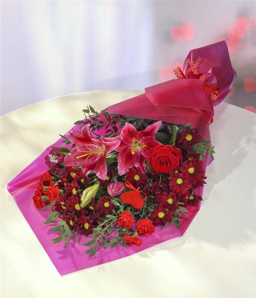 A gorgeous bouquet consisting of a selection of red & cerise flowers, including a single rose.