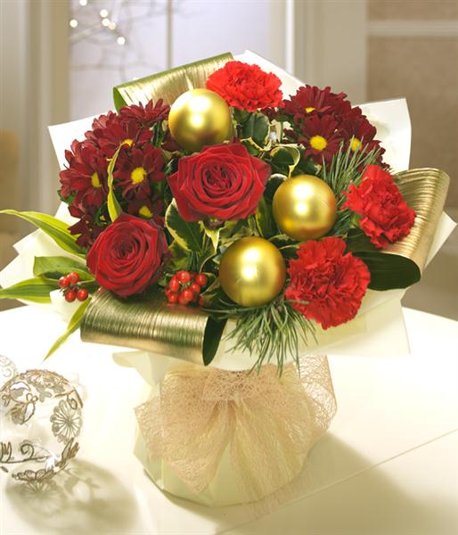 A beautiful handtie of mixed flowers including baubles and red roses.